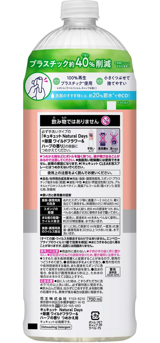 KAO キュキュット NaturalDays+除菌 ワイルドフラワー&ハーブ 替700ml 1本(ご注文単位1本)【直送品】