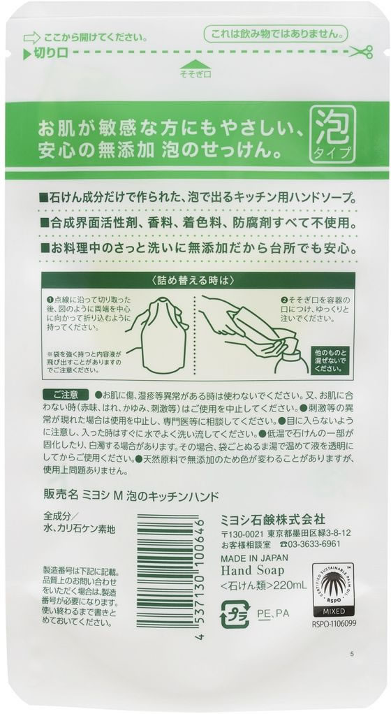 ミヨシ石鹸 無添加 せっけん 泡のキッチンハンド 詰替 220ml 1個(ご注文単位1個)【直送品】