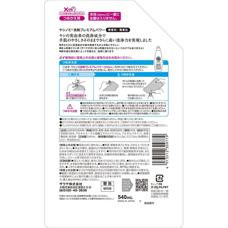 サラヤ ヤシノミ洗剤 プレミアムパワー詰替540ml 1個(ご注文単位1個)【直送品】