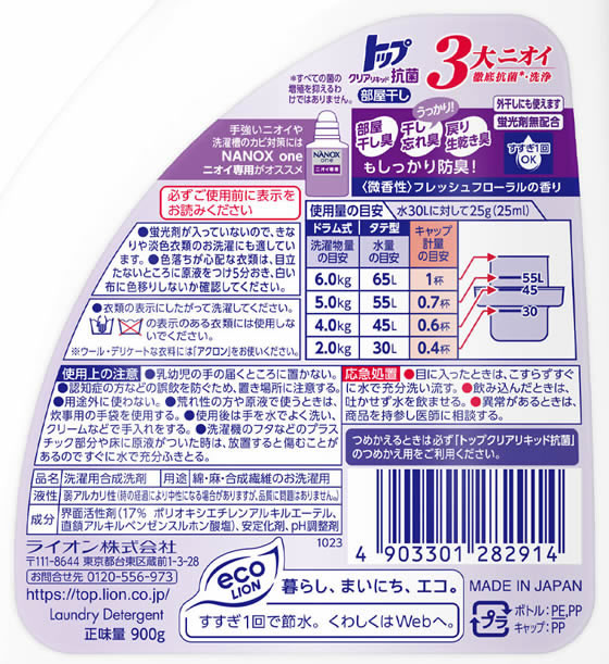 ライオン トップ クリアリキッド 抗菌 本体 900g 1個(ご注文単位1個)【直送品】