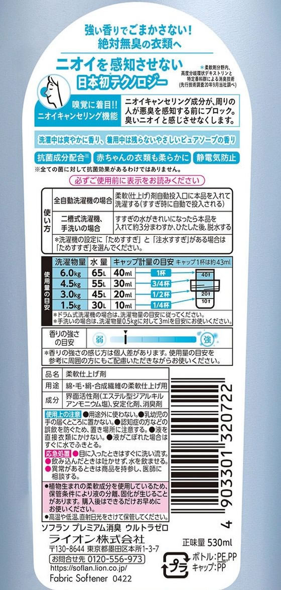 ライオン ソフラン プレミアム消臭 ウルトラゼロ 本体 530ml 1本(ご注文単位1本)【直送品】