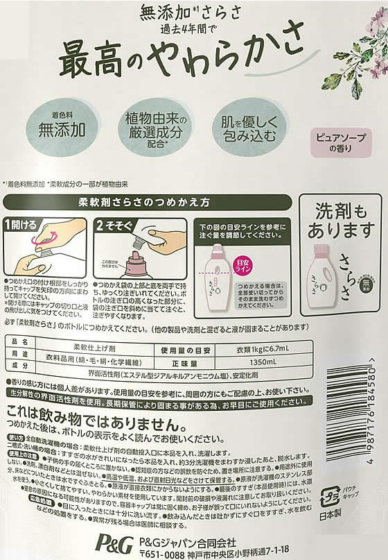 肌を優しく包み込む、ピュアソープの香り 柔軟剤さらさは着色料が無添加。植物由来の厳選成分配合。心地よい洗い上がり。ふわふわに仕上げるだけでなく、衣類をしっかり防臭。すすぎ1回OK、洗剤残りの心配なし。ピュアソープの香り ●仕様:つめかえ用●注文単位:1個※メーカーの都合により、パッケージ・仕様等は予告なく変更になる場合がございます。