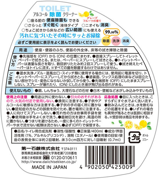 第一石鹸 ファンス トイレ用 アルコール除菌クリーナー 本体 400ml 1個(ご注文単位1個)【直送品】