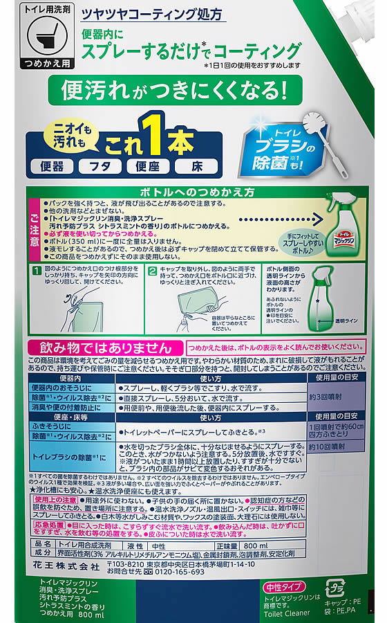 KAO トイレマジックリン消臭洗浄スプレー 汚れ予防 詰替 800ml 1個(ご注文単位1個)【直送品】