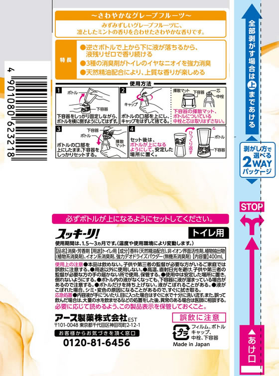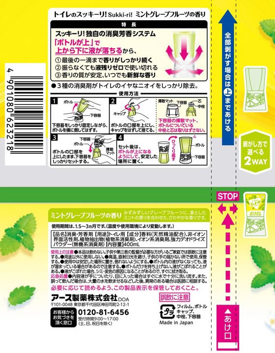 アース製薬 トイレのスッキーリ! 消臭芳香剤 ミントグレープフルーツ 400mL 1個(ご注文単位1個)【直送品】