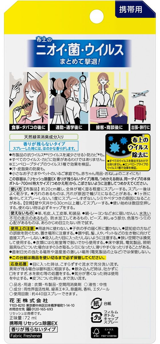 KAO 携帯用リセッシュ除菌EX 香りが残らないタイプ 72ml 1本(ご注文単位1本)【直送品】