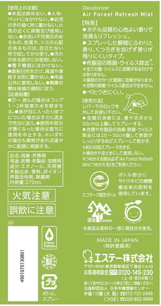 エステー AirForest リフレッシュミスト 本体 ForestGreen 1本(ご注文単位1本)【直送品】