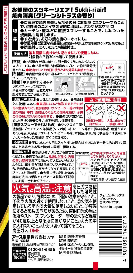 お部屋で焼肉をした翌日のあのイヤなニオイがなくなるスプレー。 ご家庭で焼肉を楽しんだその日にお部屋にスプレーすることで、焼肉後のニオイを効果的に消臭し、さわやかな空間に!カーテン・壁などに直接スプレーすることで、しみついた焼肉臭も消臭します。すき焼き、お好み焼きの後のニオイにも。除菌効果で清潔なお部屋に。(布製品への効果。全ての菌を除菌するわけではありません。)誤噴射しにくいロック機能付き。 ●香り:クリーンシトラス●成分:エタノール、水、香料、植物抽出物(植物系消臭剤)●注文単位:1個※メーカーの都合により、パッケージ・仕様等は予告なく変更になる場合がございます。