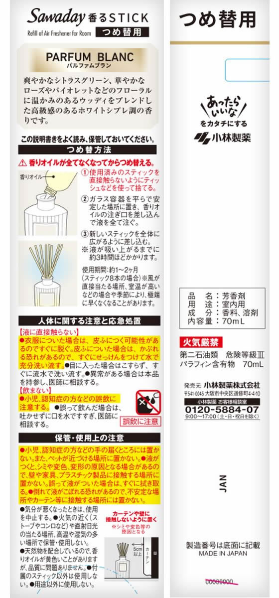 小林製薬 Sawaday香るStick パルファムブラン 詰替用 1個(ご注文単位1個)【直送品】