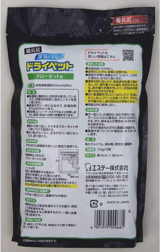 エステー 備長炭ドライペット クローゼット用 2枚入 1パック(ご注文単位1パック)【直送品】