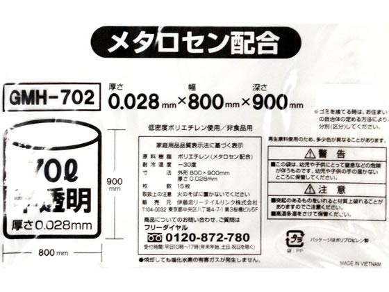 ポリゴミ袋(メタロセン配合) 半透明 70L 15枚 GMH-702 1袋(ご注文単位1袋)【直送品】