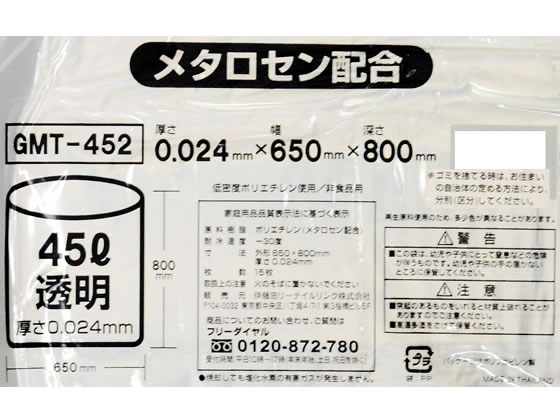 ポリゴミ袋(メタロセン配合) 透明 45L 15枚 GMT-452 1袋(ご注文単位1袋)【直送品】