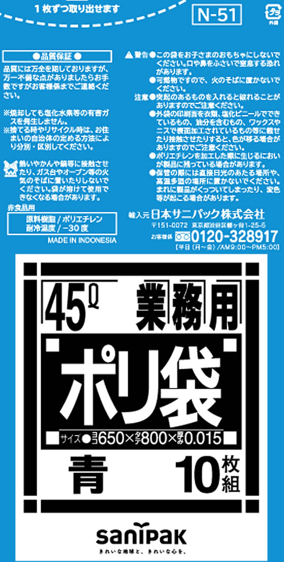 日本サニパック 業務用ポリ袋 Nシリーズ 強化 45L 青 10枚 N51 1袋(ご注文単位1袋)【直送品】