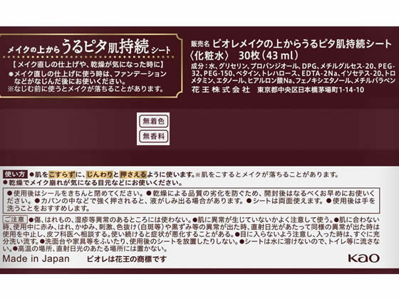 KAO ビオレ メイクの上からうるピタ肌持続シート 30枚 1パック(ご注文単位1パック)【直送品】
