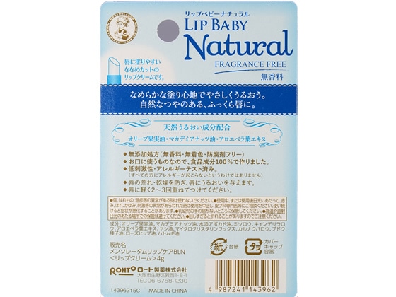 ロート製薬 メンソレータム リップベビー ナチュラル 無香料 4g 1本(ご注文単位1本)【直送品】