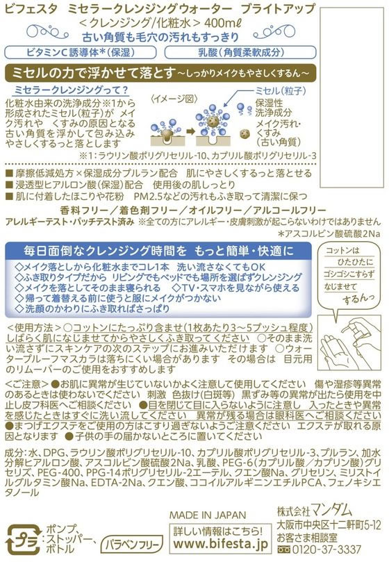 マンダム ビフェスタミセラクレンジングウォーター ブライトアップ 400ml 1本(ご注文単位1本)【直送品】