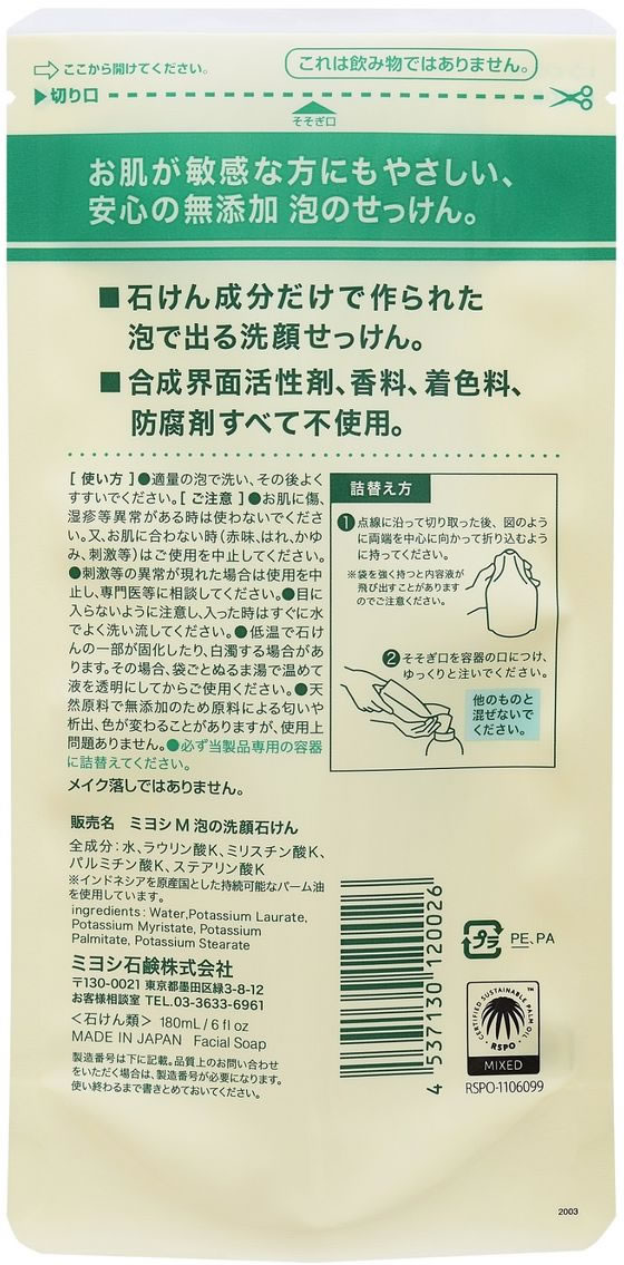 ミヨシ石鹸 無添加 泡の洗顔せっけん 詰替用 180ml 1個(ご注文単位1個)【直送品】