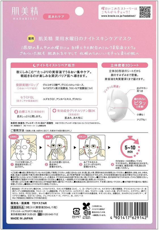 クラシエ 肌美精 薬用水曜日のナイトスキンケアマスク 3枚 1個(ご注文単位1個)【直送品】