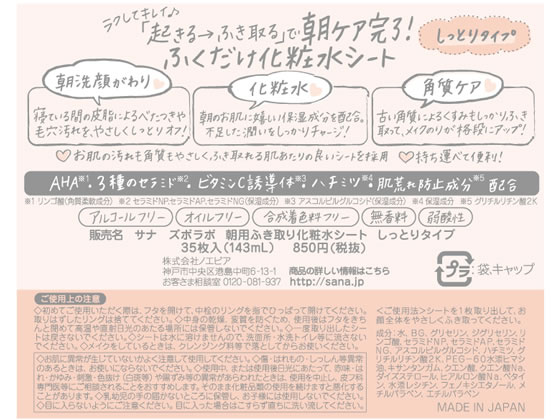 常盤薬品 サナ ズボラボ朝用ふき取り化粧水シートしっとり 1個(ご注文単位1個)【直送品】