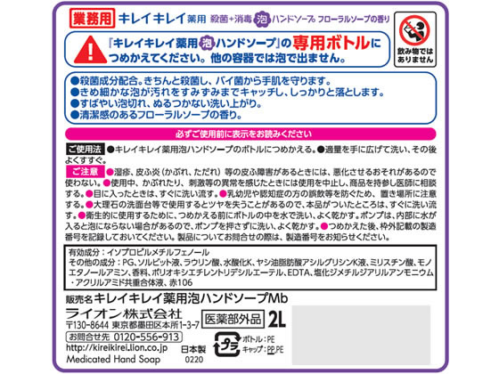 ライオンハイジーン キレイキレイ薬用泡ハンドソープ 業務用 フローラルソープ2L 1個(ご注文単位1個)【直送品】
