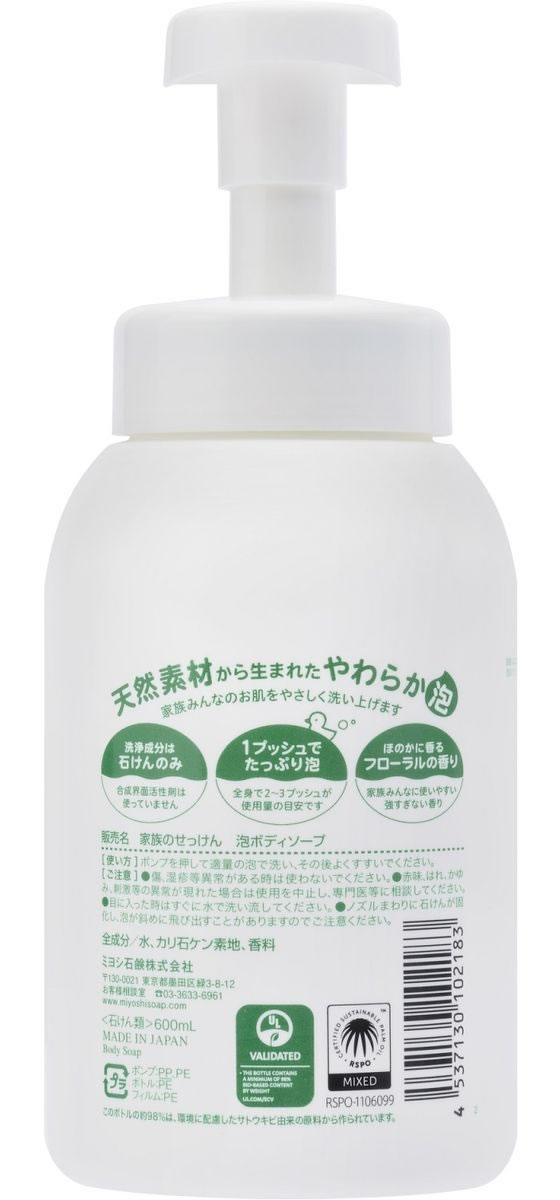 ミヨシ石鹸 家族のせっけん 泡ボディソープ 600ml 1本(ご注文単位1本)【直送品】