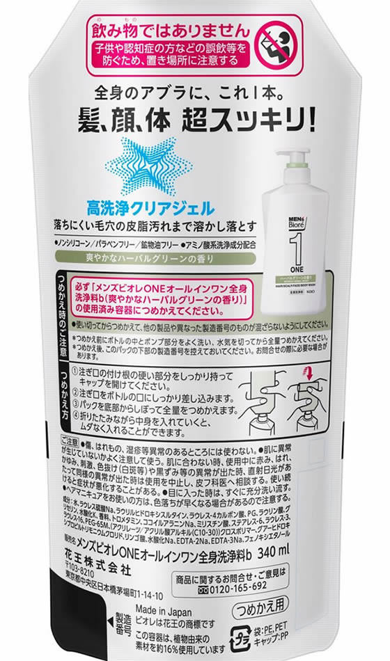 KAO メンズビオレ 1 ONE 全身洗浄料ハーバルグリーン詰替340ml 1個(ご注文単位1個)【直送品】