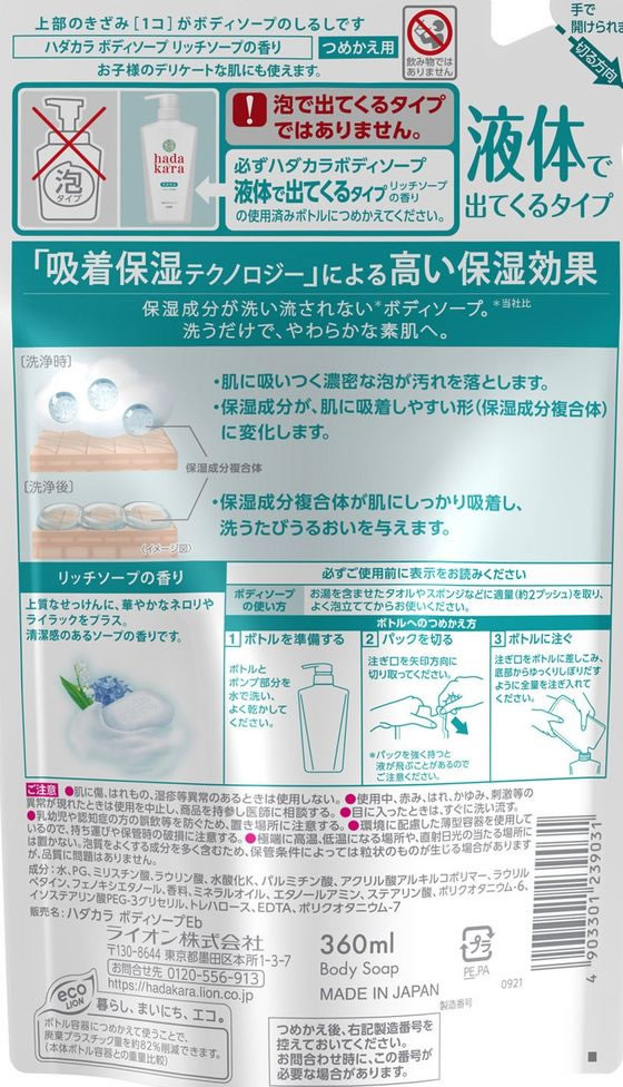 ライオン hadakara(ハダカラ)ボディソープ リッチソープの香り 詰替 1個(ご注文単位1個)【直送品】