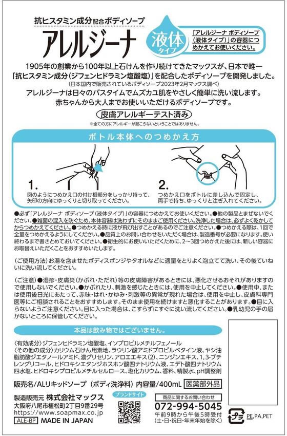マックス アレルジーナ 抗ヒスタミン成分配合 ボディソープ 詰替 400ml 1個(ご注文単位1個)【直送品】