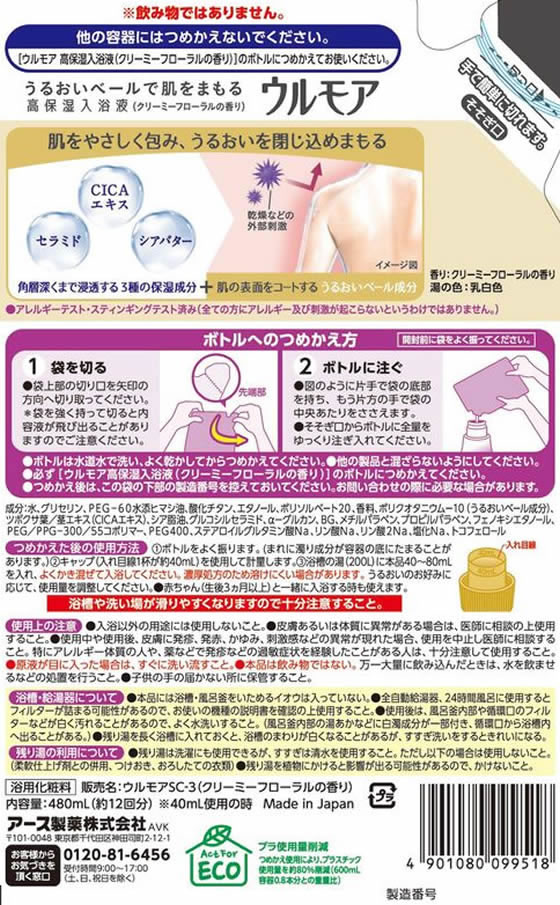 アース製薬 ウルモア 高保湿入浴液 クリーミーフローラル 詰替 480ml 1個(ご注文単位1個)【直送品】