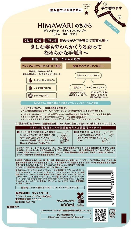 クラシエ ディアボーテ オイルインシャンプー スムース&リペア 詰替用 400ml 1個(ご注文単位1個)【直送品】