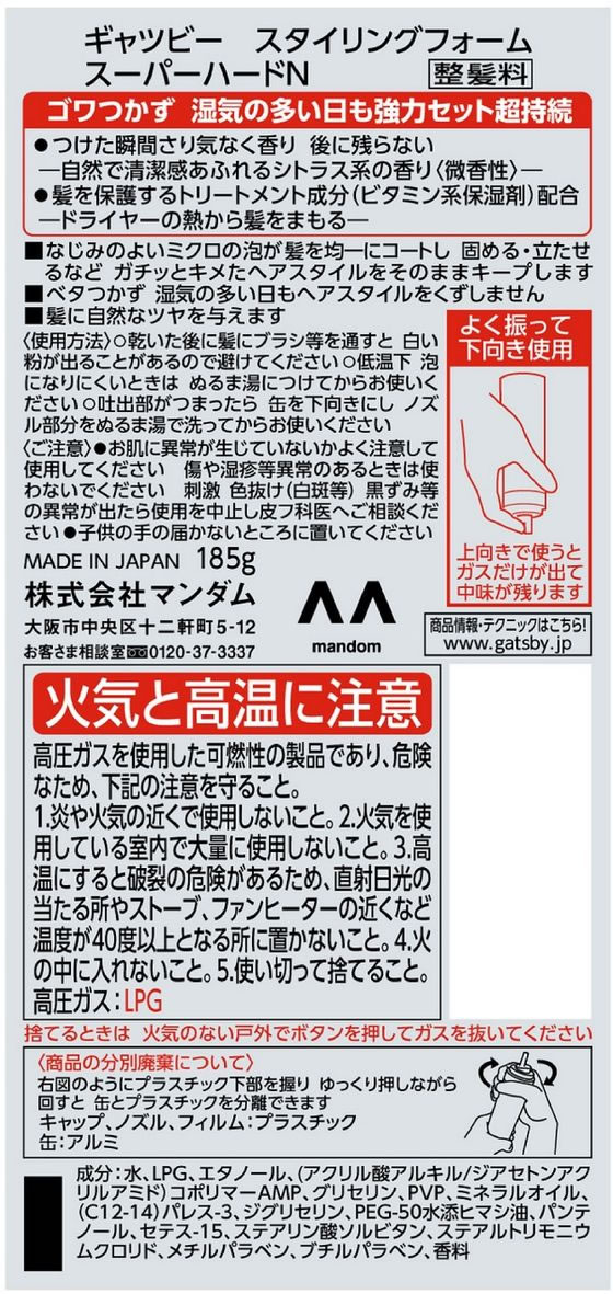 マンダム ギャツビー スタイリングフォーム スーパーハード 185g 1本(ご注文単位1本)【直送品】