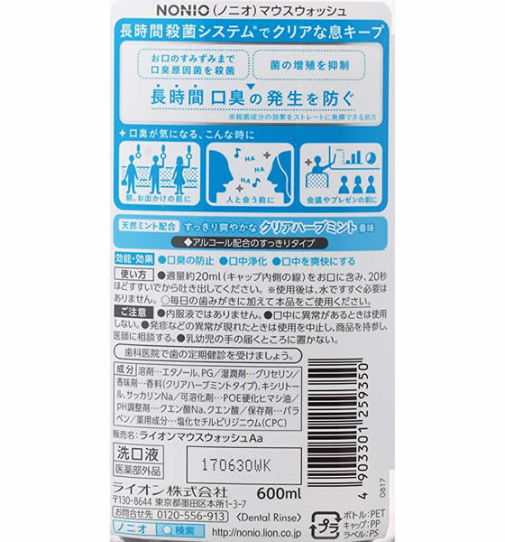 ライオン NONIO マウスウォッシュ 600ml クリアハーブミント 1本(ご注文単位1本)【直送品】