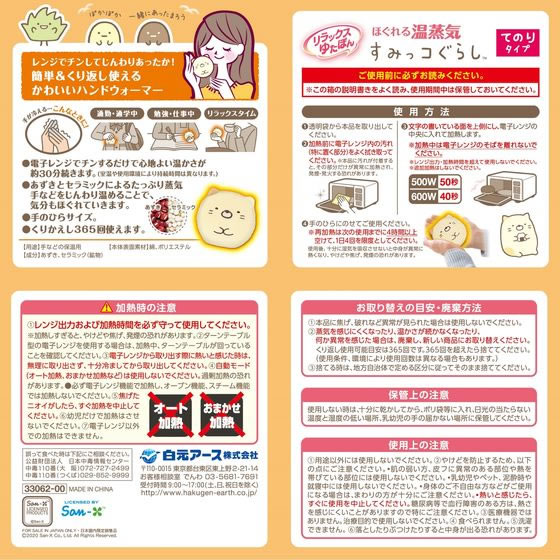 かわいいデザインで気分もリラックス 手のひらサイズのリラックスゆたぽん。電子レンジでチンするだけで心地よい温かさが約30分続きます。(室温や使用環境により持続時間は異なります。)あずきとセラミックによるたっぷり蒸気で手などをじんわり温めることで気分もほぐれていきます。手のひらサイズ。くり返し365回使えます。 ●成分:あずき、セラミック(鉱物)●本体表面素材:綿、ポリエステル●入数:1個※メーカーの都合により、パッケージ・仕様等は予告なく変更になる場合がございます。