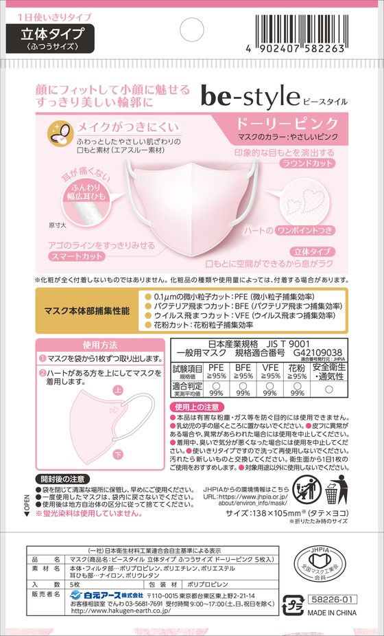 白元アース ビースタイル 立体 ふつう ドーリーピンク 5枚 1パック(ご注文単位1パック)【直送品】