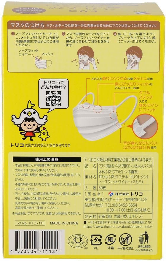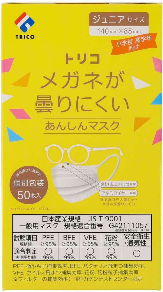トリコ メガネが曇りにくい あんしんマスク ジュニア 50枚 1箱(ご注文単位1箱)【直送品】
