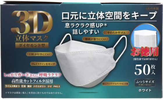 カネイシ 3D立体マスクダイヤモンド型 ホワイト お徳用50枚 405815 1箱(ご注文単位1箱)【直送品】