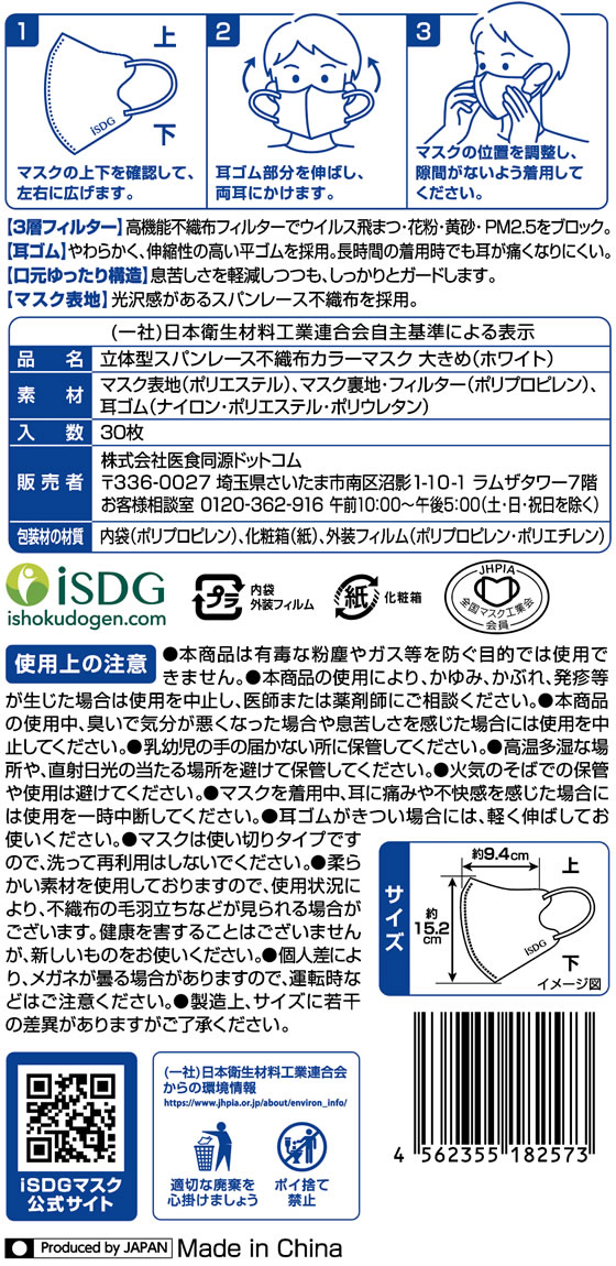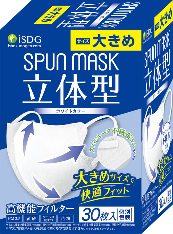 医食同源 立体型 スパンレース不織布マスク ホワイト 大きめ 30枚 1箱(ご注文単位1箱)【直送品】
