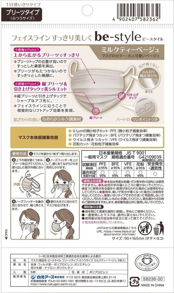 白元アース ビースタイル プリーツ ふつう ミルクティベージュ 5枚 1パック(ご注文単位1パック)【直送品】