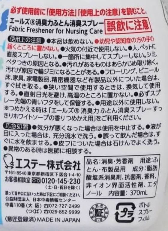 エステー エールズ介護家庭用消臭力ふとん消臭スプレー本体370ml 1本(ご注文単位1本)【直送品】
