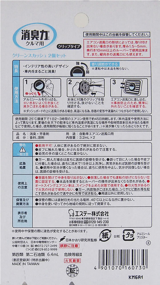 エステー クルマの消臭力 クリップタイプ2個セット クリーンスカッシュ 1パック(ご注文単位1パック)【直送品】