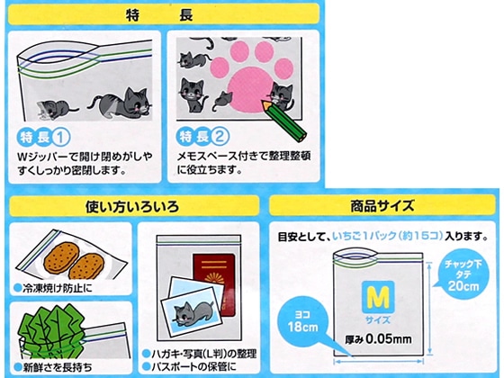 システムポリマー 猫柄 ストックバックWジッパーBox M(18×20cm) 18枚 1箱(ご注文単位1箱)【直送品】