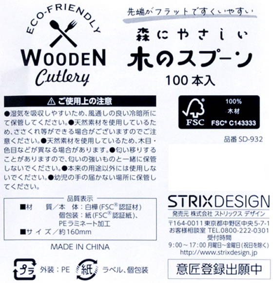 ストリックスデザイン 木製スプーン160mm 100本 SD-932 1袋(ご注文単位1袋)【直送品】