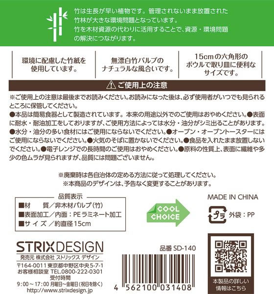ストリックスデザイン バンブーペーパー 六角ボウル 15cm 12枚 1パック(ご注文単位1パック)【直送品】