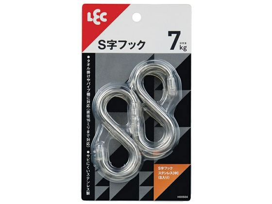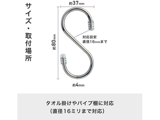重い物も吊るせるステンレスタイプ! ●使い勝手の良いサイズのS字フックです。●タオル掛けやパイプ棚等に対応できます。(直径16ミリまで対応)●さびにくいステンレス製です。 ●本体サイズ:約37×4×80Hmm●内容量:8個●材質:ステンレス鋼線●荷重制限:7kg●生産国:中国【使用上の注意】・万一の落下にそなえて貴重品やこわれやすいものを掛けたり付近に置かないでください。・火のそばで使用しないでください。・荷重制限をお守りください。・本品を掛ける対象物(パイプ等)の荷重・強度を確認してからご使用ください。・掛け外しの際、掛けたものの落下には充分ご注意ください。・無理にねじったり、強い衝撃を与えると破損することがあります。・直射日光や風雨にさらされる場所での長期にわたる使用は、製品劣化の原因になりますのでご注意ください。※メーカーの都合により、パッケージ・仕様等は予告なく変更になる場合がございます。