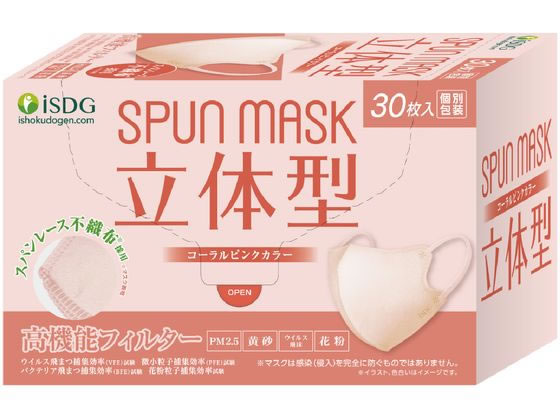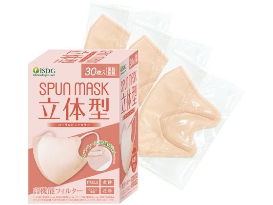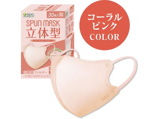 医食同源 立体型スパンレース不織布カラーマスク コーラルピンク 30枚 1箱(ご注文単位1箱)【直送品】