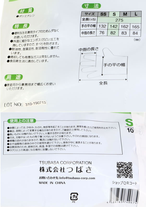 つばさ ポリエチレン手袋 外エンボス Sサイズ ブルー 100枚 1袋(ご注文単位1袋)【直送品】