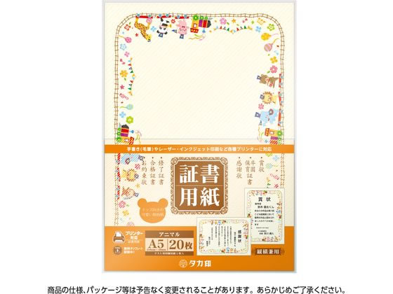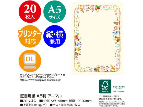 ササガワ 証書用紙 A5判 アニマル 20枚 10-1720 1袋(ご注文単位1袋)【直送品】