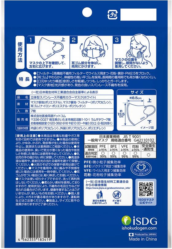 医食同源 立体型スパンレース不織布カラーマスク ホワイト 7枚入 1袋(ご注文単位1袋)【直送品】