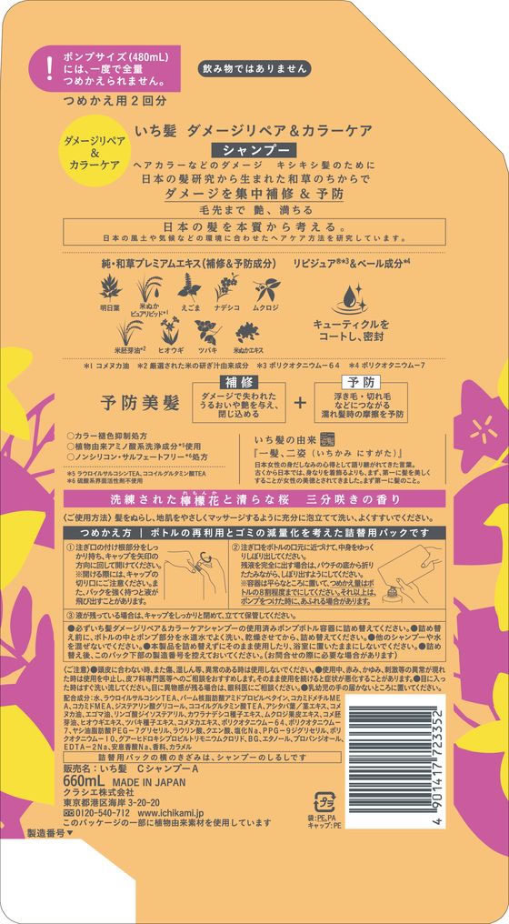 クラシエ いち髪 ダメージリペア&カラーケア シャンプー 詰替 660mL 1個(ご注文単位1個)【直送品】