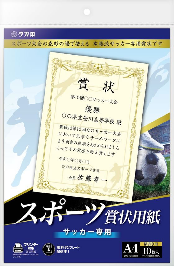 ササガワ スポーツ賞状用紙 A4判 サッカー 横書用 10枚 10-1800 1パック(ご注文単位1パック)【直送品】